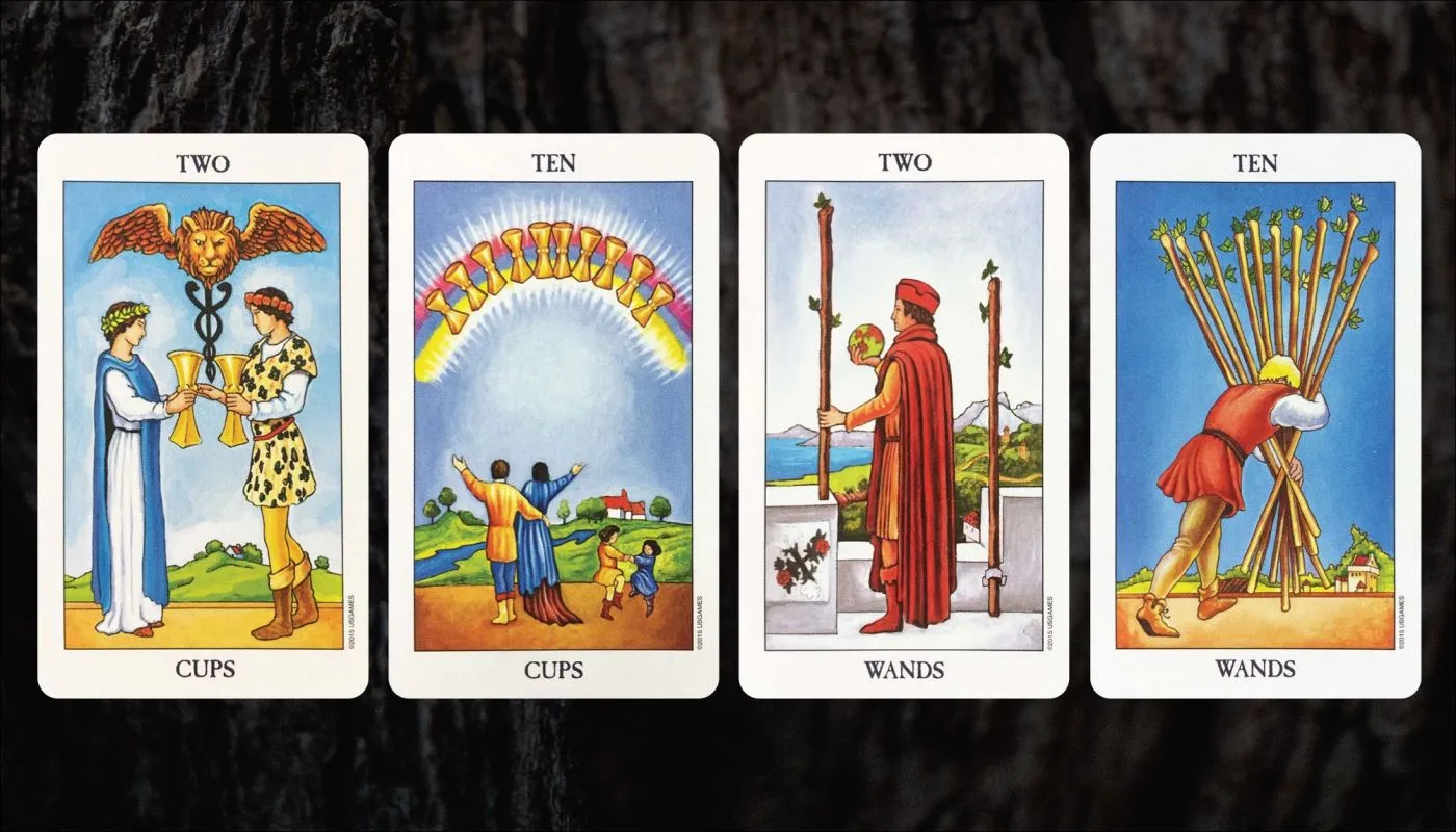 Het Tarotdeck bevat ook vele inspirerende kaarten, vooral in de reeks van de Kelken, die emoties vertegenwoordigen. Deze kaarten leren ons dat geluk voortkomt uit emotionele intelligentie. De Staven daarentegen onthullen het succes van menselijk vernuft, waarbij de Tien van Staven ons waarschuwt voor onze fysieke grenzen. De Twee van Staven markeert het begin van creatieve of wetenschappelijke ondernemingen, terwijl de Zes van Staven triomf en vooruitgang in kunst en wetenschap symboliseert.